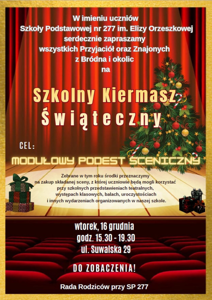 Serdecznie zapraszamy całą społeczność szkolną – uczniów, rodziców, nauczycieli oraz wszystkich przyjaciół szkoły – na Szkolny Kiermasz Świąteczny, który odbędzie się we wtorek, 16 grudnia 2025r., w godzinach 15:30–19:30.