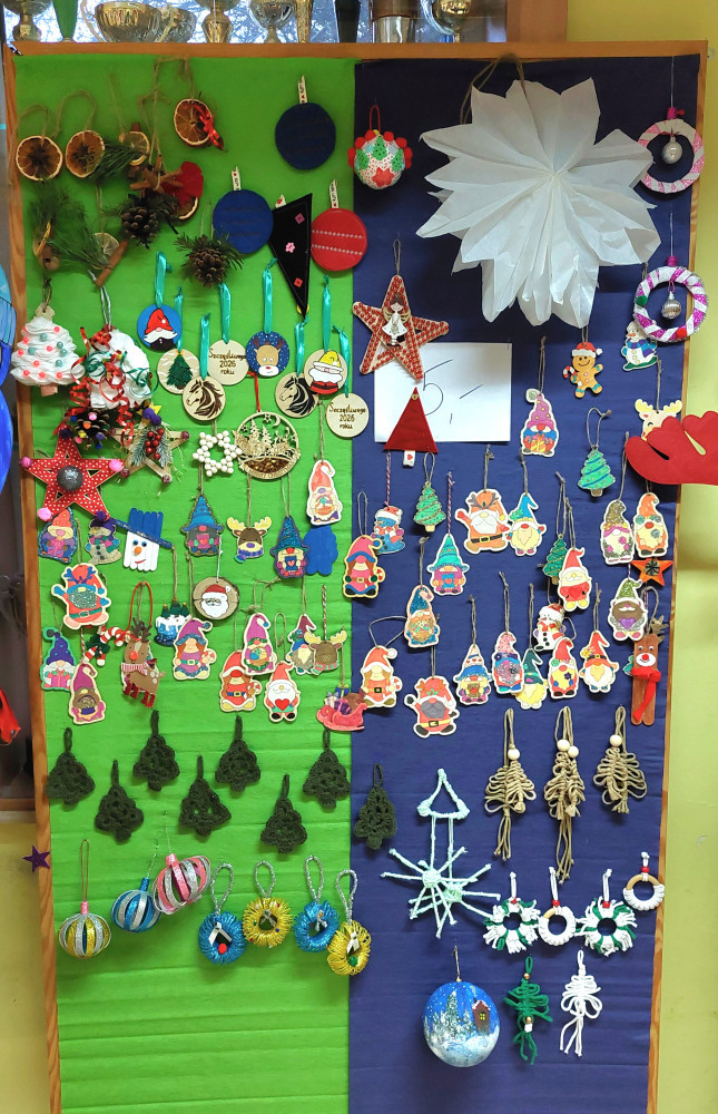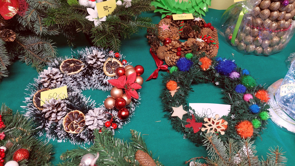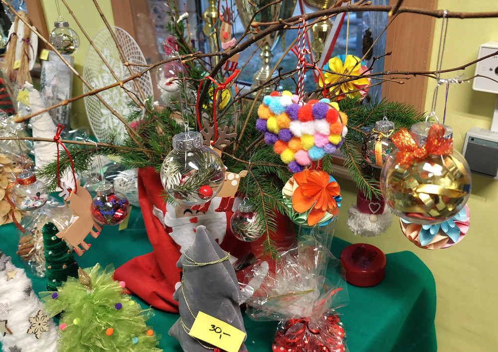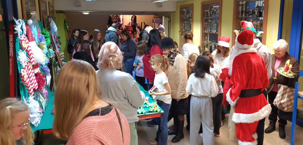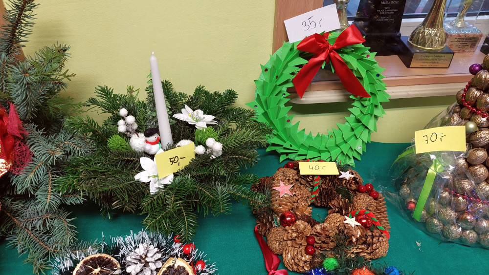 W tym dniu korytarz przy sali gimnastycznej zamienił się w świąteczną krainę bożonarodzeniowych ozdób. Na specjalnie przygotowanych stoiskach znalazły się stroiki, choinki, świeczniki oraz mnóstwo innych przepięknych ozdób choinkowych. Wszystkie dzieła były bardzo pomysłowe i kolorowe, ich autorzy wykazali się ogromną kreatywnością.