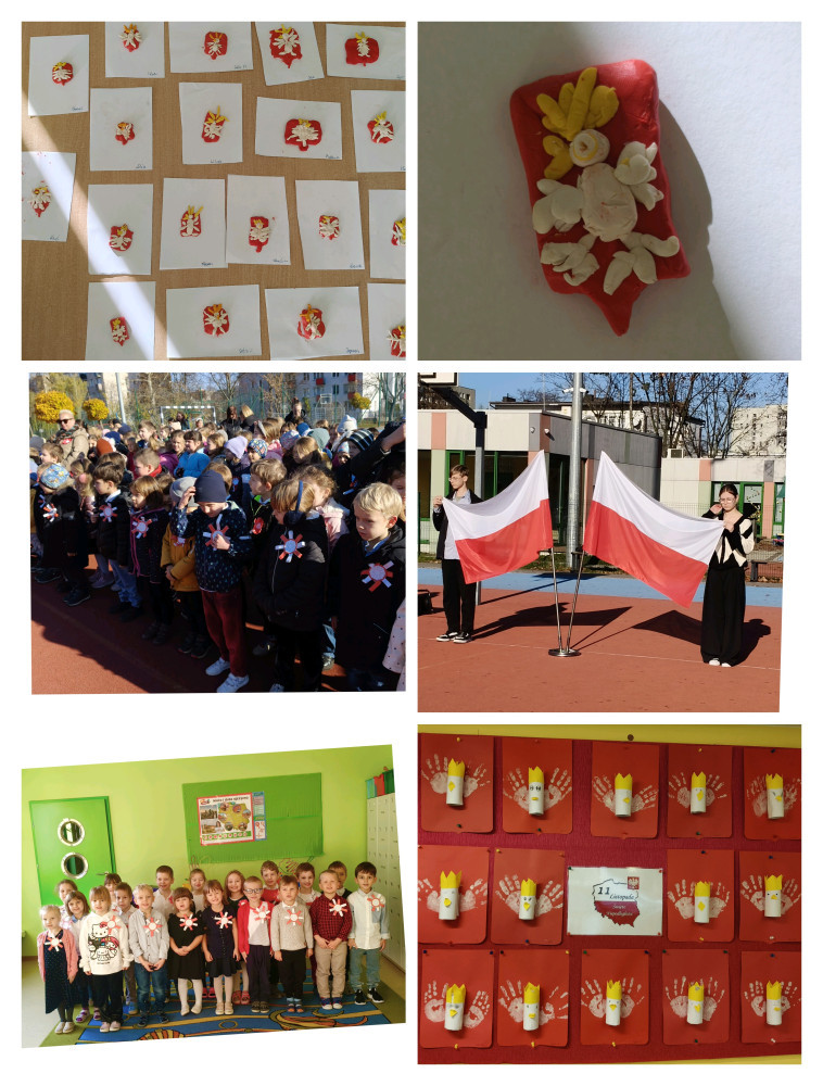 7.11 dzieci z przedszkola obchodziły wspólnie ze szkołą święto Niepodległości. Śpiewały Hymn Narodowy. Wcześniej przygotowały własnoręcznie kokardy narodowe, wylepiły z plasteliny i przygotowały z kolorowego papieru godło, zapoznały się z historią Polski, rozbiorów i położenia geograficznego.