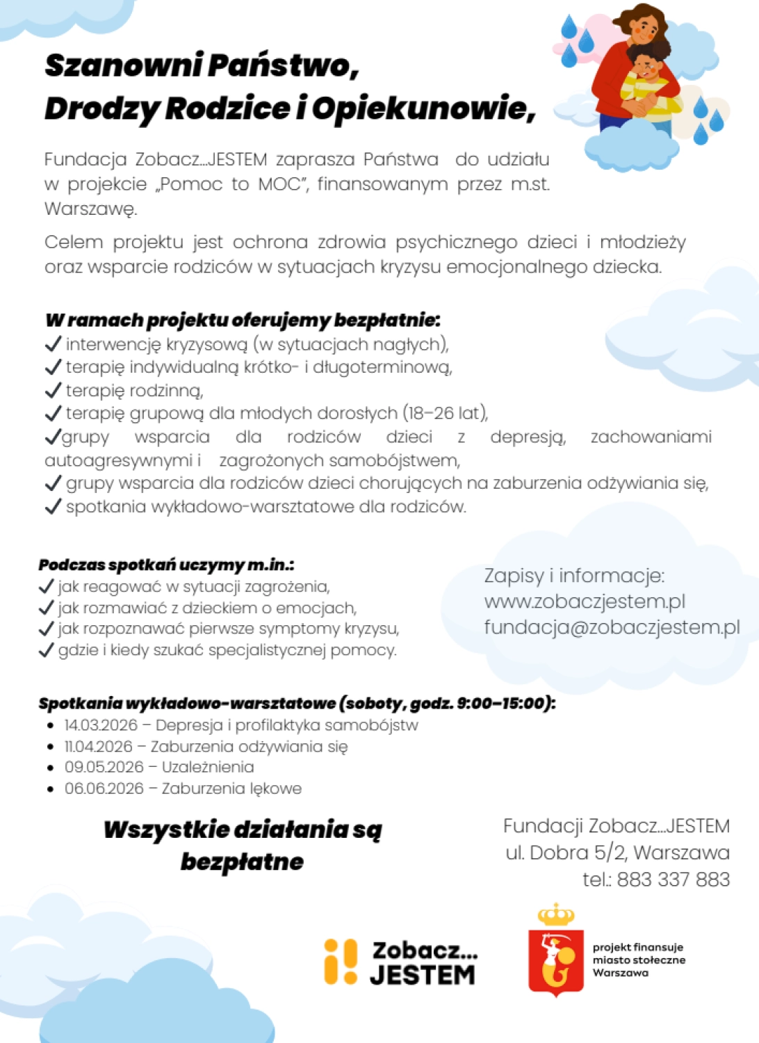 Fundacja Zobacz…JESTEM zaprasza do udziału w bezpłatnym projekcie finansowanym przez m.st. Warszawę. Oferujemy interwencję kryzysową, terapię, grupy wsparcia oraz warsztaty dla rodziców (depresja, zaburzenia odżywiania się, uzależnienia, lęk).